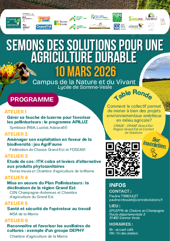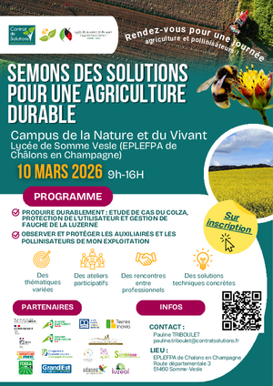 Le Campus de la Nature et du Vivant de Somme Vesle et le Contrat de Solutions ont le plaisir de vous inviter à une journée technique multipartenaire dédiée à la durabilité des exploitations agricoles, le mardi 10 mars 2026. Cette rencontre s'adresse aux agriculteurs, techniciens, conseillers et acteurs du monde rural qui souhaitent faire avancer la transition, avec la force du collectif. Au programme de cette journée, des ateliers interactifs seront animés par des structures professionnelles locales et permettront d'échanger positivement sur les enjeux sanitaires, phytos et biodiversité. Au-delà des contenus techniques, cette journée se veut un temps fort de rencontres et de synergies : retours d'expérience, construction de partenariats, identification de nouvelles pratiques pour sécuriser à la fois les rendements et les services écosystémiques.